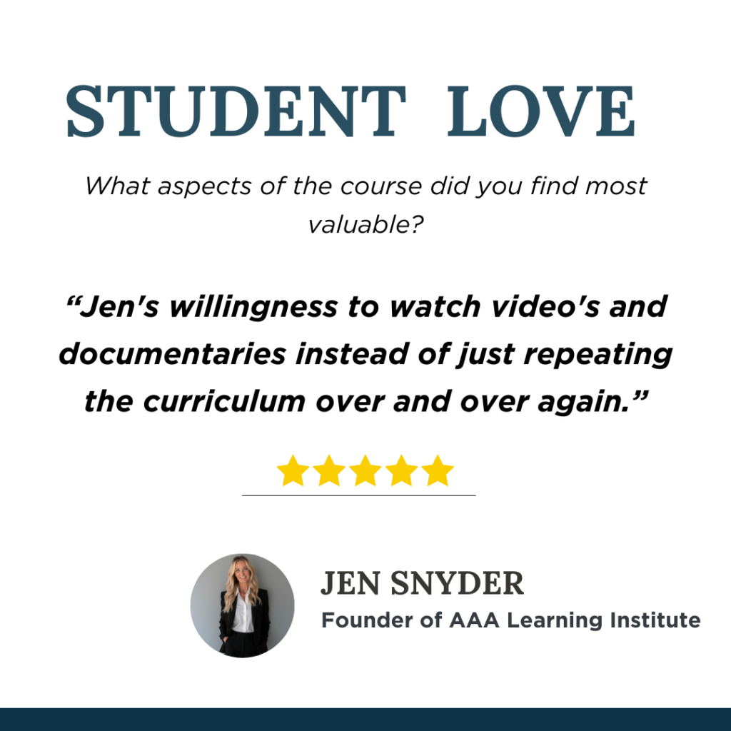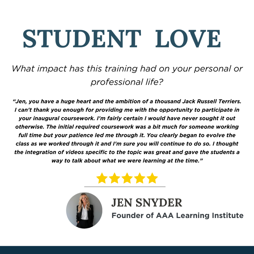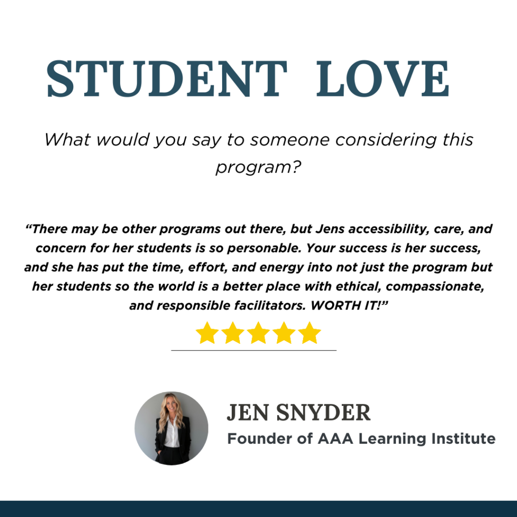 Jen Snyder is the founder and program director of AAA Learning Institute, bringing extensive expertise in facilitation and training.